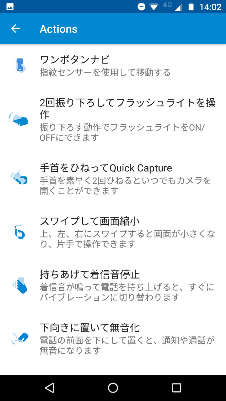 Moto G5は基本的に素のAndroidですが、Moto Actionsという独自機能も搭載されており、例えば縦に2回振ることによってLEDが点灯したり、横に2回ひねることによってカメラが起動したりします。