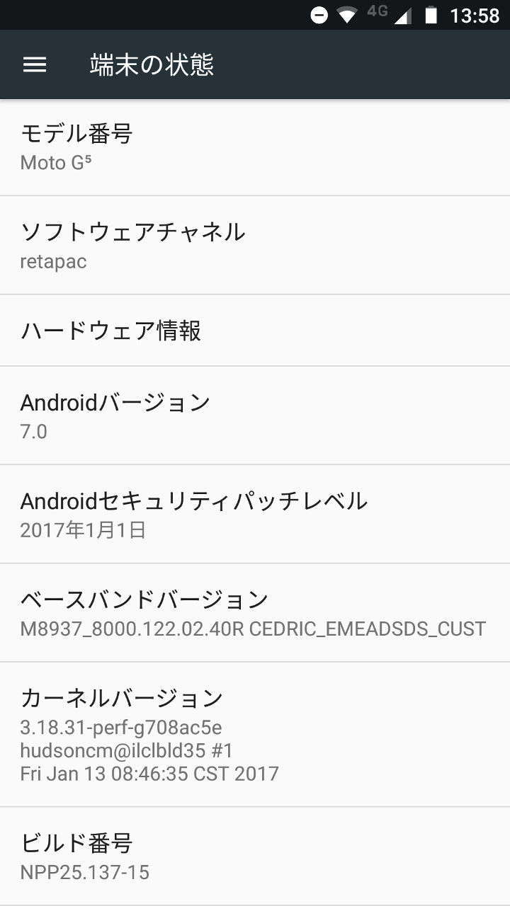 | 機種名 (型番) | Moto G5 (XT1676) |