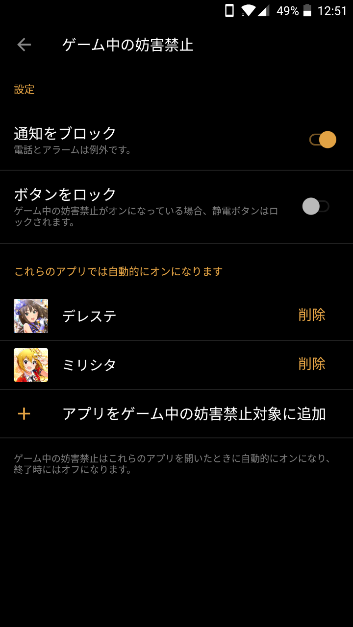 また、機能面では色々と手が加えられており、かゆいところに手が届く仕様となっています。個人的に特に気に入っているのが “ゲーム中の妨害禁止” という機能で、指定したアプリを起動している間は通知を表示しないようにすることができます。デレステなどの音ゲーをプレイする際にとても重宝する機能です。