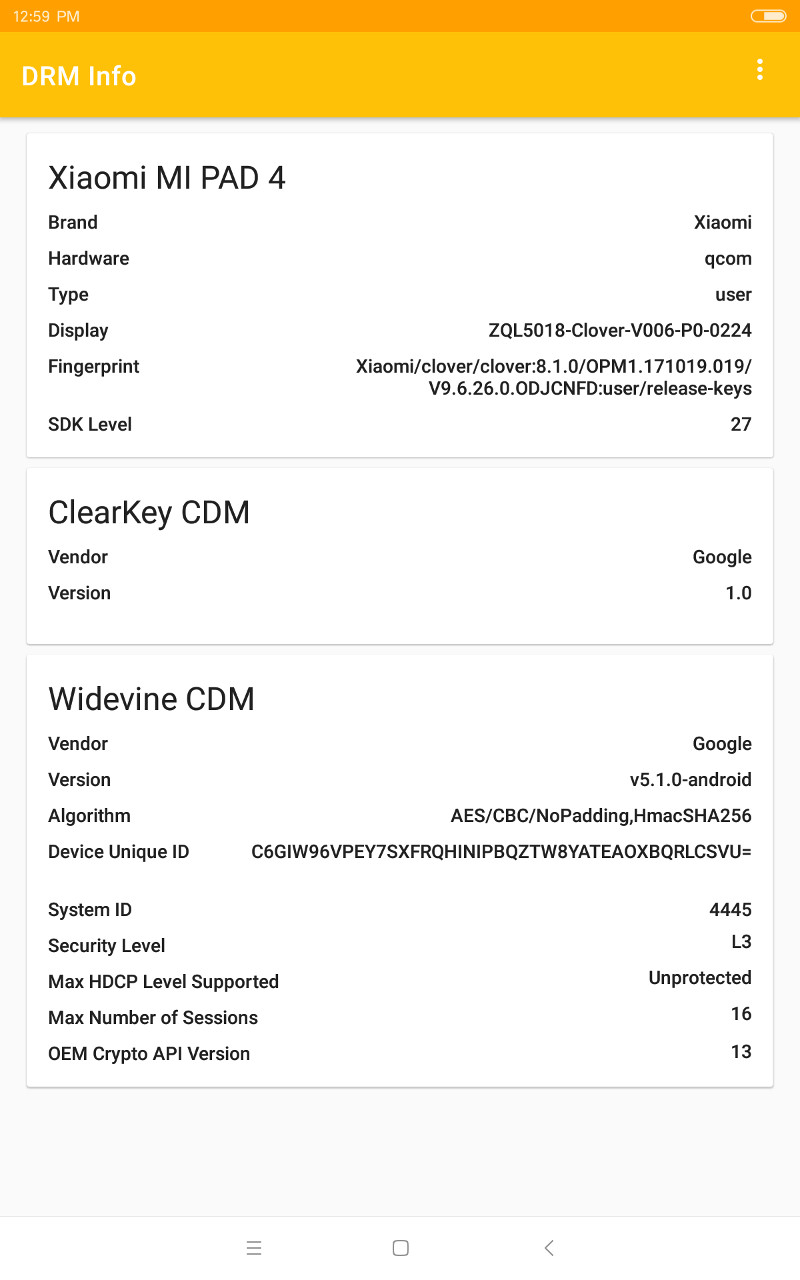 Mi Pad 4はWidevine DRMがL3なので、AmazonビデオやNetflixなどのアプリは画質が制限されます。 (仮にL1だったとしてもカスタムROMを焼いたら結局L3になってしまうので、カスタムROMを焼くつもりの人は気にする必要はありません)